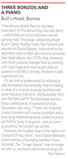 I attach a couple of pics from the evening -it was stunning and to see something I'd only heard on record or seen on video performed in this small venue in so wonderful a way that you felt that we could have been in the Albert Hall! the effect was so entrancing, or, as Oscar would have had it: "Well f**** me lads I fancy the one with the shiny t*** Mill***l for ever!".